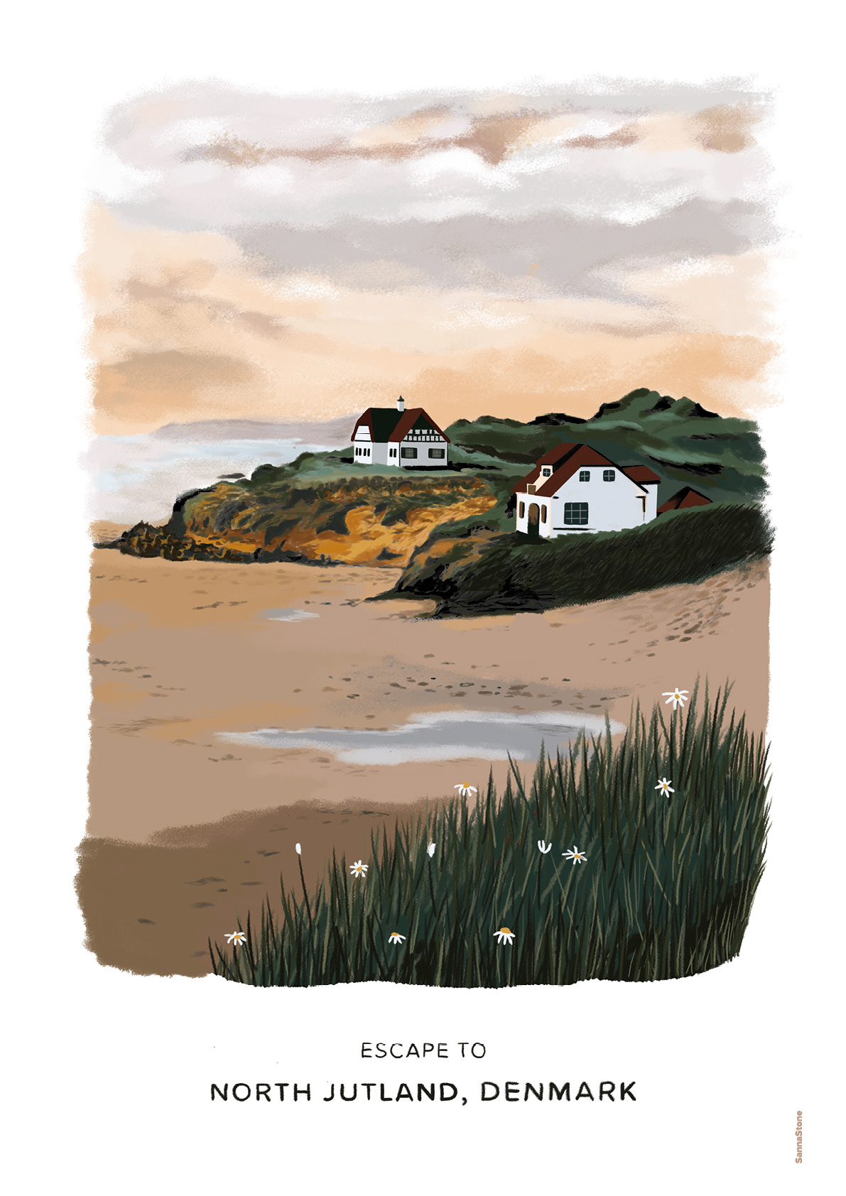 Juliste "Escape to North Jutland, Denmark". Kauniita paikkoja maailmassa-sarjan ensimmäinen juliste Tanskan idylliseltä ja luonnonkauniilta rannikolta. Piirretty Photoshopilla. Myynnissä Julistamossa koossa A2, 50x70cm ja 70x100cm.