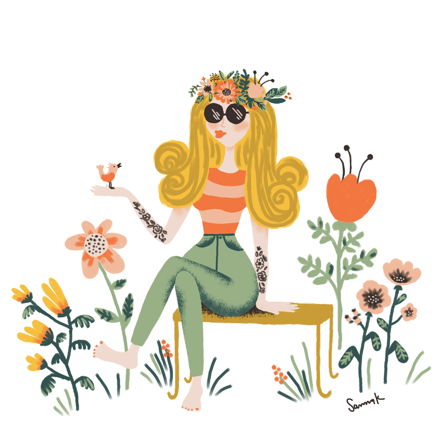"Happy hippie girl" kuvitus Women Who Draw -sivustolle: