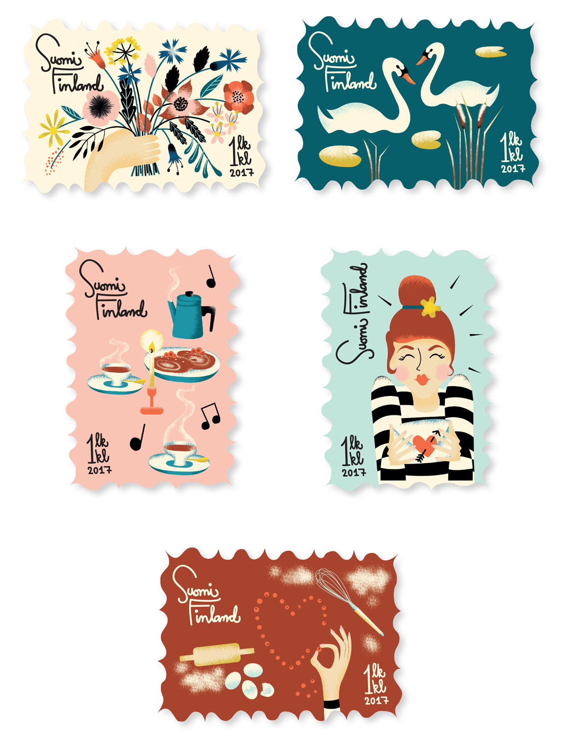 Ystävänpäivä postimerkit Postin, Grafian and Kuvittajat ry:n järjestämään kilpailuun. Kokoelman nimi on "The most wonderful day".